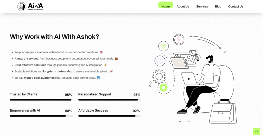 AI with Ashok empowers entrepreneurs and small businesses by integrating AI solutions and providing strategic coaching. From automating operations to enhancing decision-making, they offer personalized services to drive growth and efficiency.